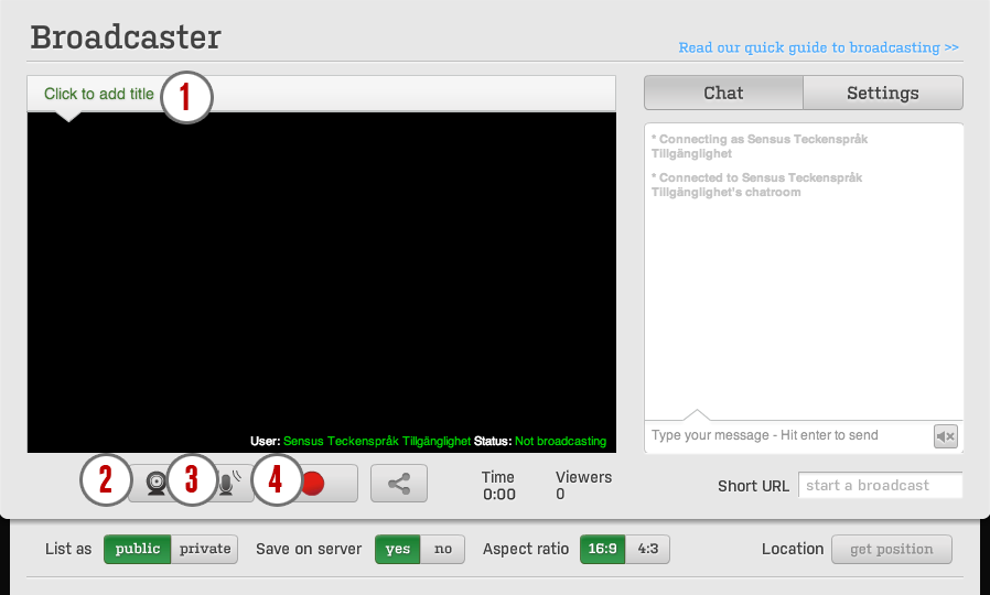 4. När du är redo att starta en sändning, så klickar du på den röda knappen. Du gör samma sak när du vill avsluta en sändning.